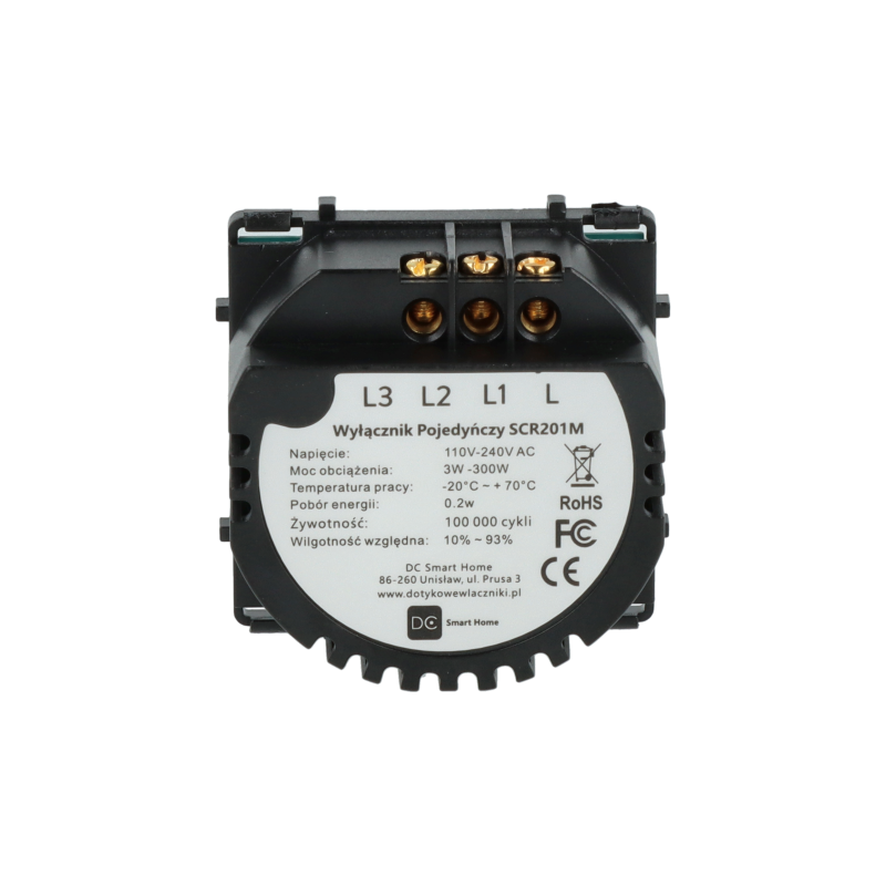 Wkład włącznika światła dotykowego DC Smart Home pasuje do wszystkich standardowych puszek elektrycznych. Dzięki temu, montaż modułu jest prosty i szybki, nie wymagający żadnych dodatkowych adaptacji.