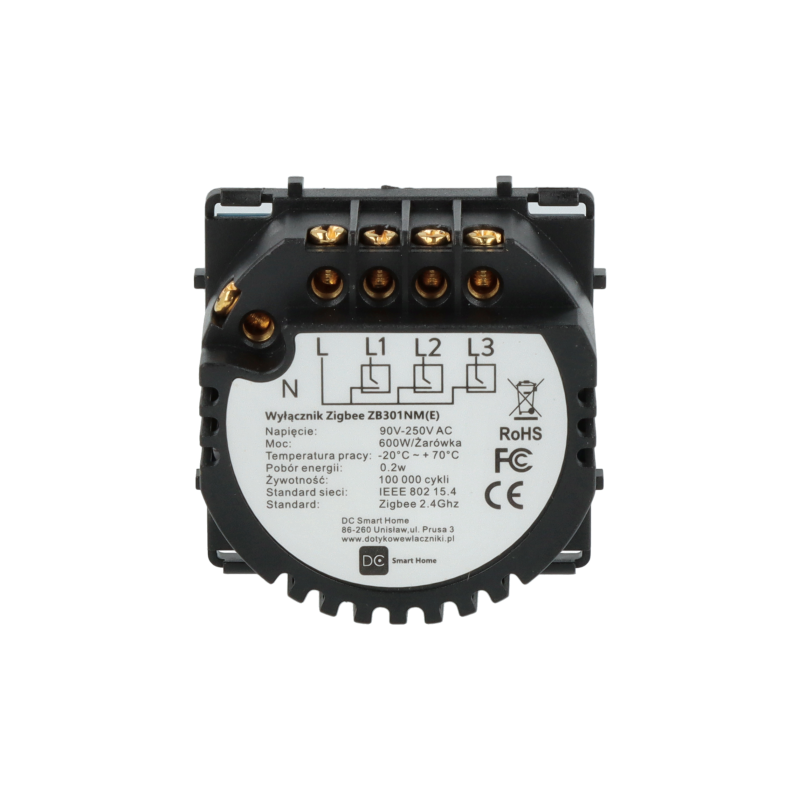 Wkład włącznika światła dotykowego DC Smart Home łączy się z bramką ZigBee 2.4GHz. Moduł łącznika jest kompatybilny w wszystkimi naszymi panelami szklanymi DC Smart Home.