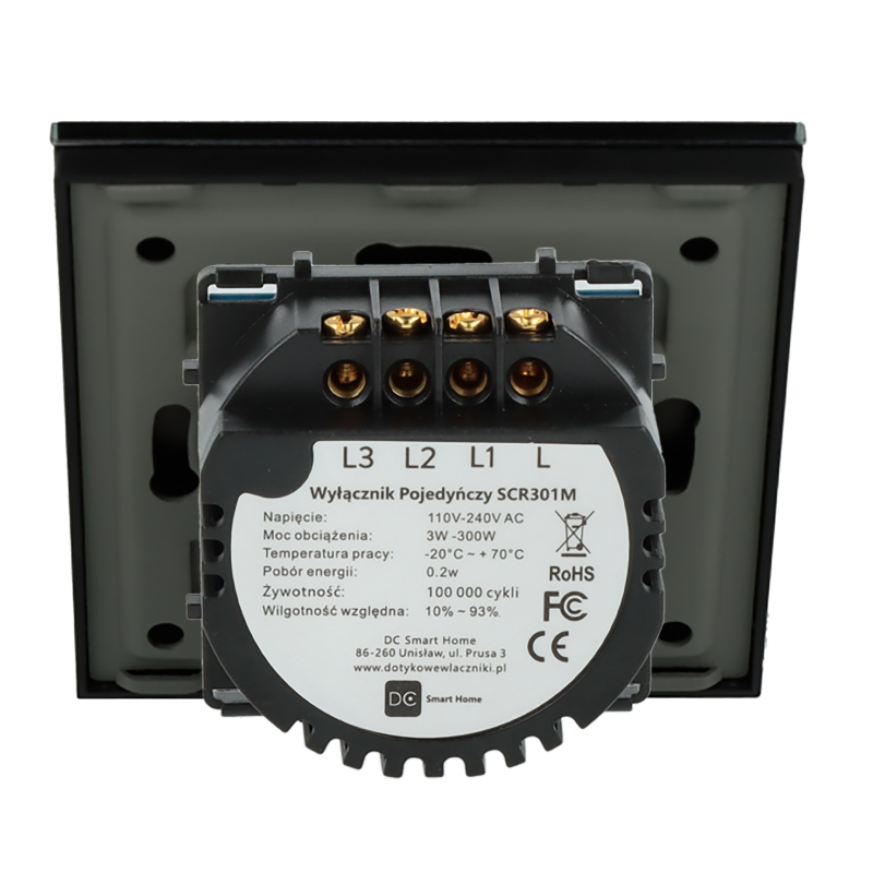- Panel Szklany: Jest to zewnętrzna część włącznika, wykonana z eleganckiego, trwałego szkła hartowanego. Panel ten ma powierzchnię dotykową, która reaguje na dotyk użytkownika, umożliwiając kontrolę oświetlenia.