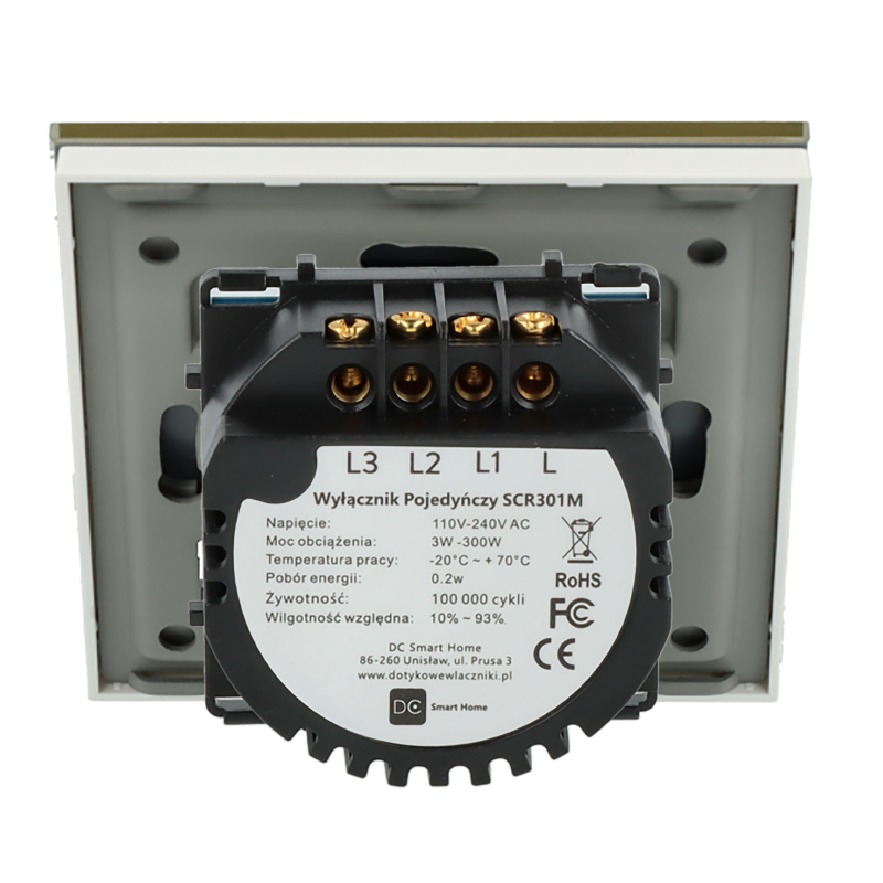 - Panel Szklany: Jest to zewnętrzna część włącznika, wykonana z eleganckiego, trwałego szkła hartowanego. Panel ten ma powierzchnię dotykową, która reaguje na dotyk użytkownika, umożliwiając kontrolę oświetlenia.