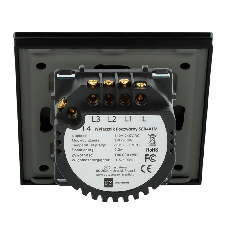 - Panel Szklany: Jest to zewnętrzna część włącznika, wykonana z eleganckiego, trwałego szkła hartowanego. Panel ten ma powierzchnię dotykową, która reaguje na dotyk użytkownika, umożliwiając kontrolę oświetlenia.