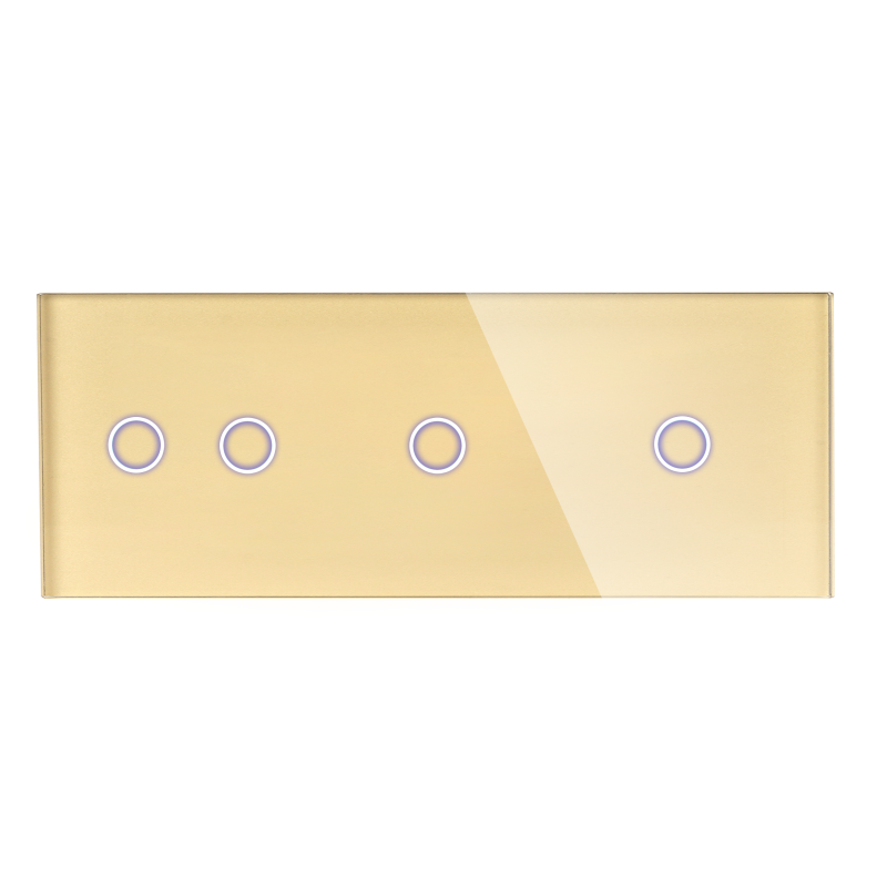Panel szklany Potrójny Złoty, przeznaczony do modułów włączników światła dotykowych dostępnych w naszym sklepie, to elegancka i stylowa opcja, która doda klasy i nowoczesności Twoim wnętrzom. Wykonany z wysokiej jakości materiałów, panel posiada wiele zalet, takich jak: